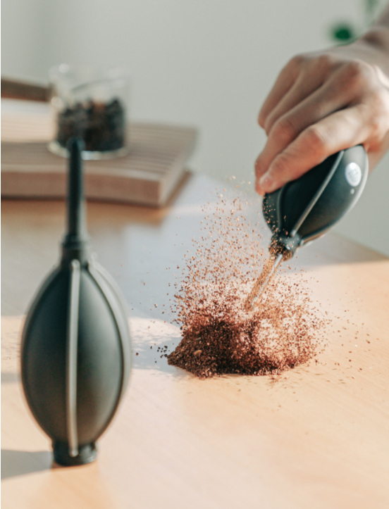 Our new product air blower is launching and it is the strongest CP combination of the coffee bean grinder. It is with small body and big hurricane and it can be lightly pressed to remove residual powder.