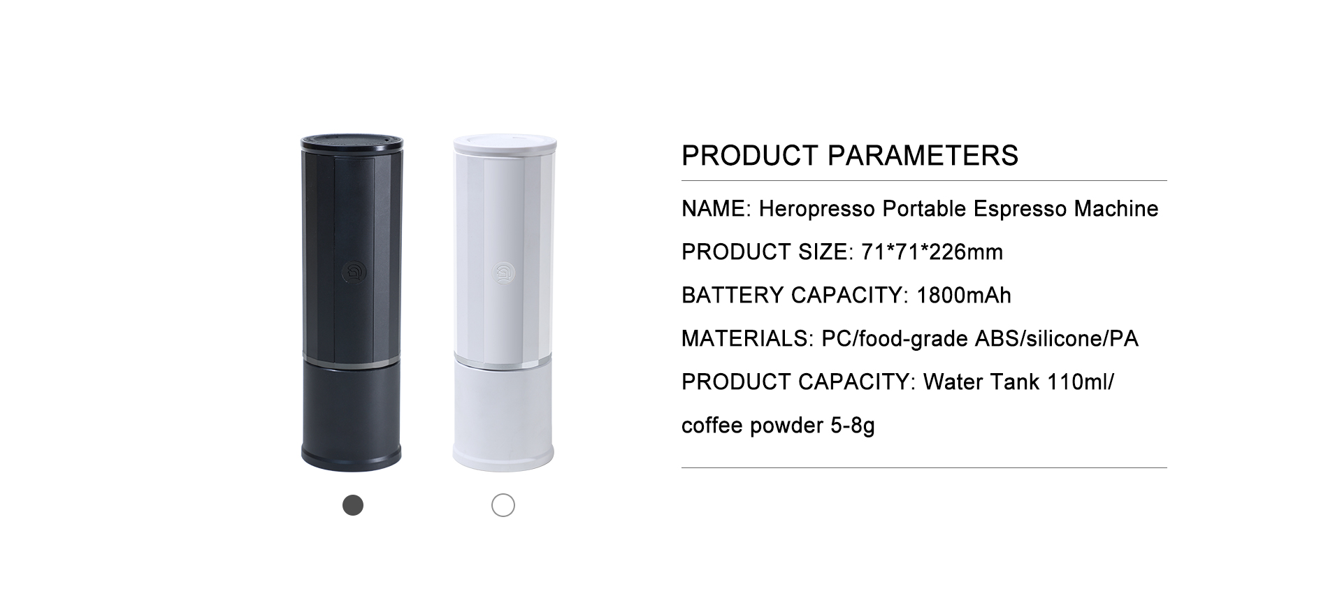 Product Name:Heropresso Portable Espresso Machine Product Size: 71*71*226mm Battery Capacity:1800mAh Materials:PC/food-grade ABS/silicone/PA Product Capacity:Water Tank 110ml/coffee powder 5-8g