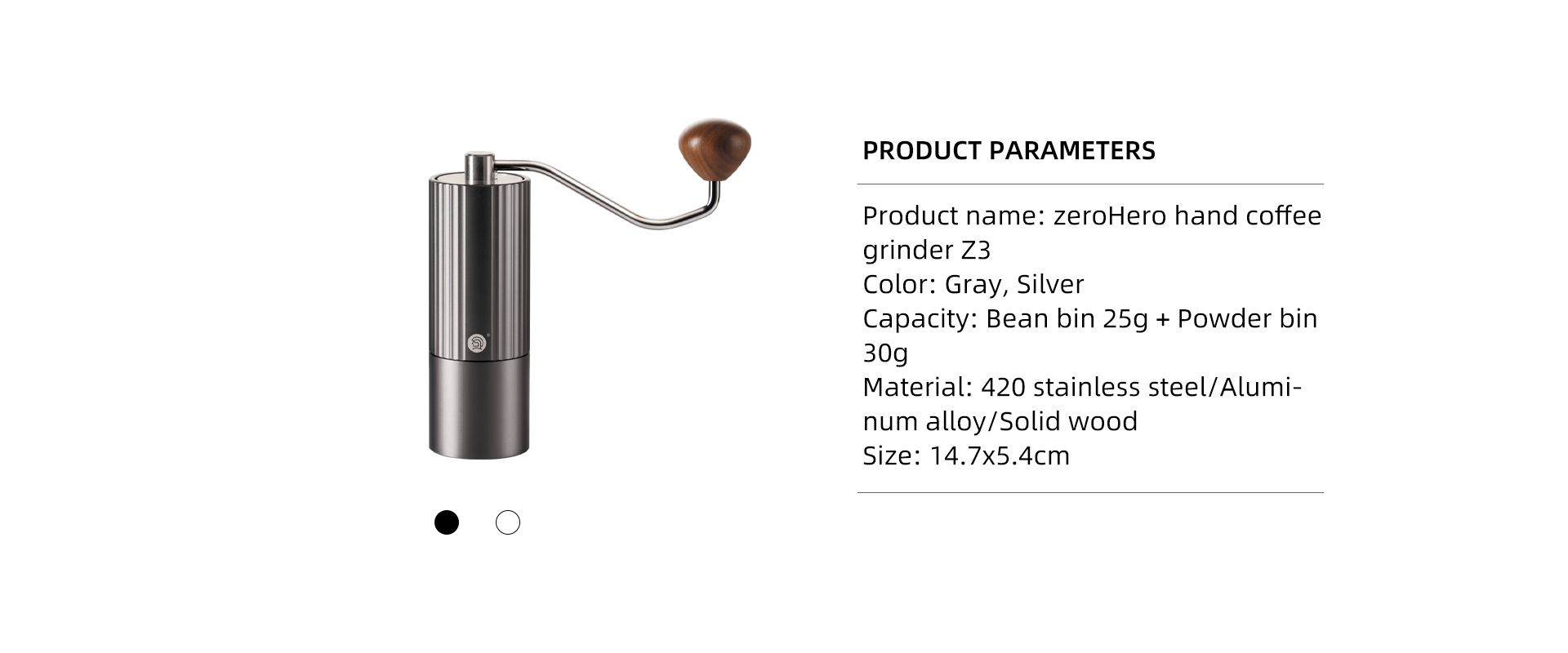 Model: Z3 Manual Coffee Grinder Material: 420 Stainless Steel Capacity: Bean 25g + Powder 30g Color: Grey, Silver